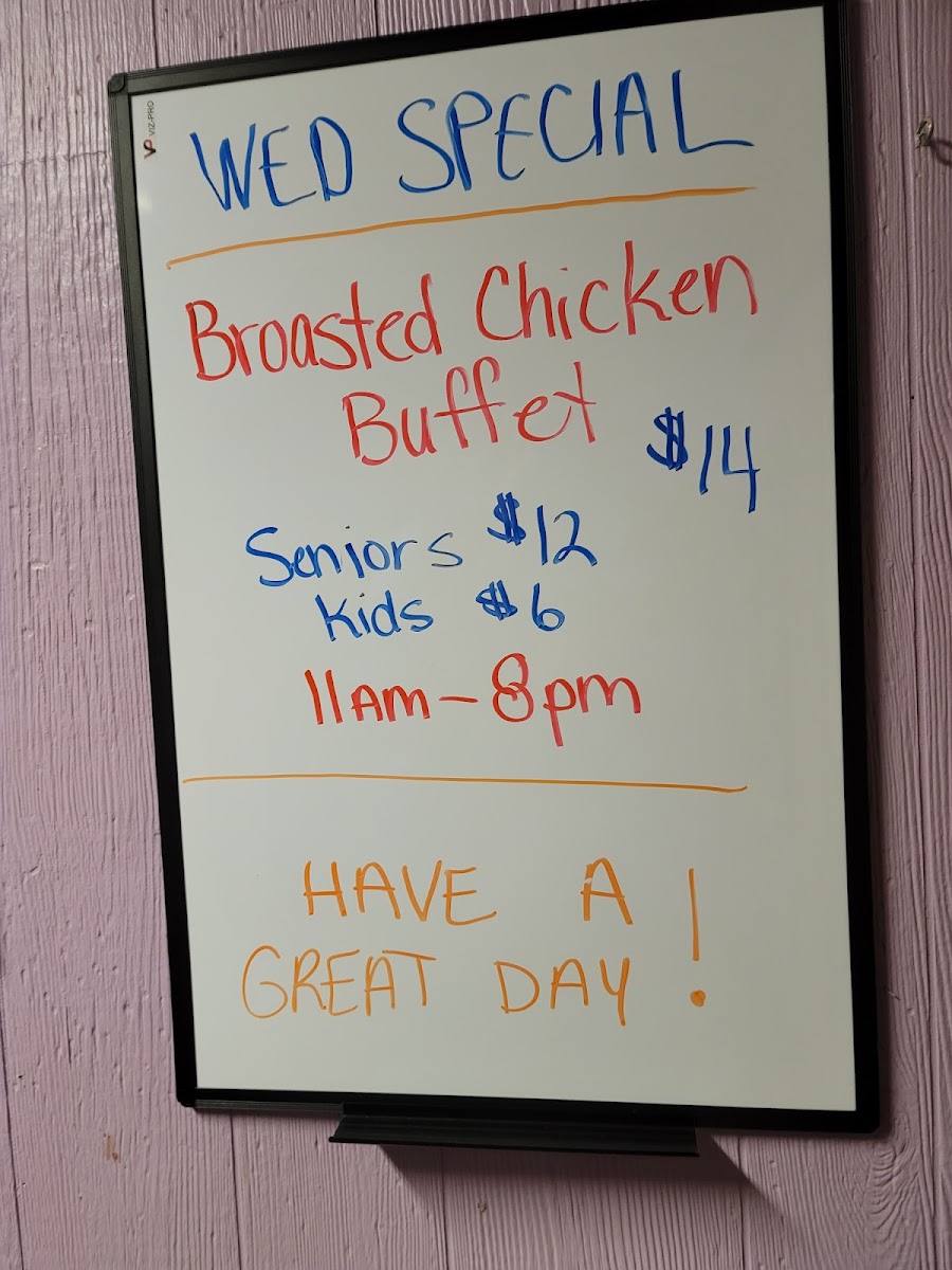 Guests can enjoy hearty options like broasted chicken, fried shrimp dinners, or a generous taco salad. Lighter bites and familiar comfort foods, such as tomato soup and meatloaf, also make frequent appearances. The salad bar adds a fresh touch, while breakfast favorites like French toast and English muffins provide cozy morning choices.